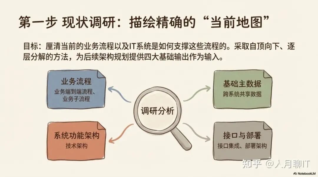 IT现状调研包括:现有应用系统功能架构、IT基础设施架构、IT对业务的支撑情况。调研输出覆盖四个方面:业务流程、业务数据、系统功能、接口集成和部署,这正是后续四大架构规划的基础。