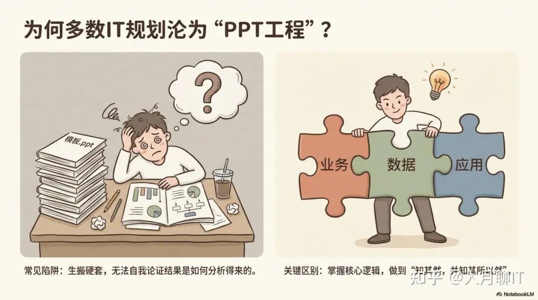 当前很多IT顾问只是"PPT顾问",拿着现有模板到处套用。这种生搬硬套最大的问题是:即使有了输出结果,也无法详细论证结果如何分析得来,更无法应对不熟悉的行业领域。