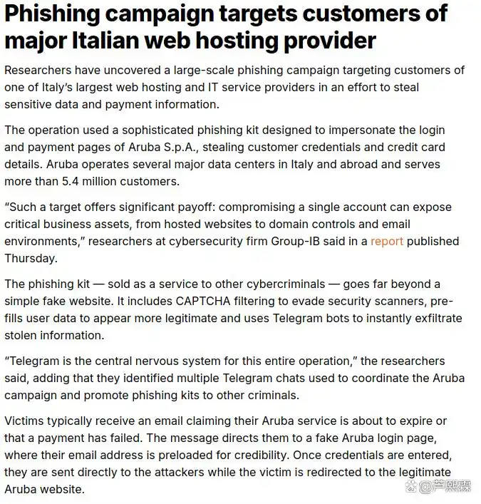 近年来,针对特定行业或区域用户的定向钓鱼攻击(Spear Phishing)呈现显著上升趋势。2025年11月,安全研究人员披露了一起大规模钓鱼活动,专门针对意大利知名网络托管服务商Aruba S.p.A.的客户。攻击者通过伪造“域名发票未支付”“账户验证失败”等高时效性主题邮件,诱导用户访问高度仿真的登录与支付页面,进而窃取凭证、信用卡信息及一次性验证码。本文基于该事件,系统分析此类攻击的技术架构、社会工程诱因、基础设施特征及数据外泄路径,并结合实际样本提出多层次防御体系。研究涵盖邮件内容策略、品牌仿冒识别、多因素认证强化、域名操作保护机制及企业级安全运营建议。文中提供可部署的自动化检测脚本示例,包括相似域名生成与监控、邮件URL跳转链解析、Telegram Bot通信特征提取等关键技术实现。结果表明,仅依赖终端用户警惕性不足以抵御此类高度定制化攻击,需构建“技术+流程+意识”三位一体的纵深防御模型。