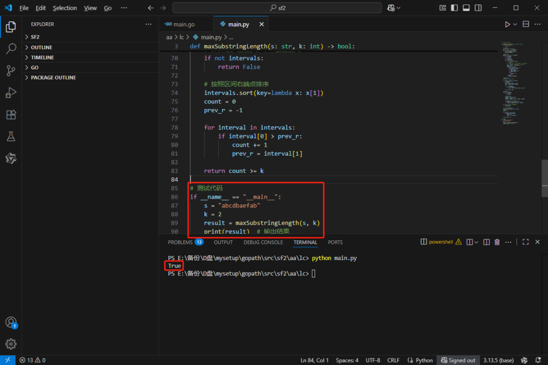 2025-08-25:选择 K 个互不重叠的特殊子字符串。用go语言,给定长度为 n 的字符串 s 和整数 k,判断是否能从 s 中挑出 k 个互相没有重叠的合格子串。