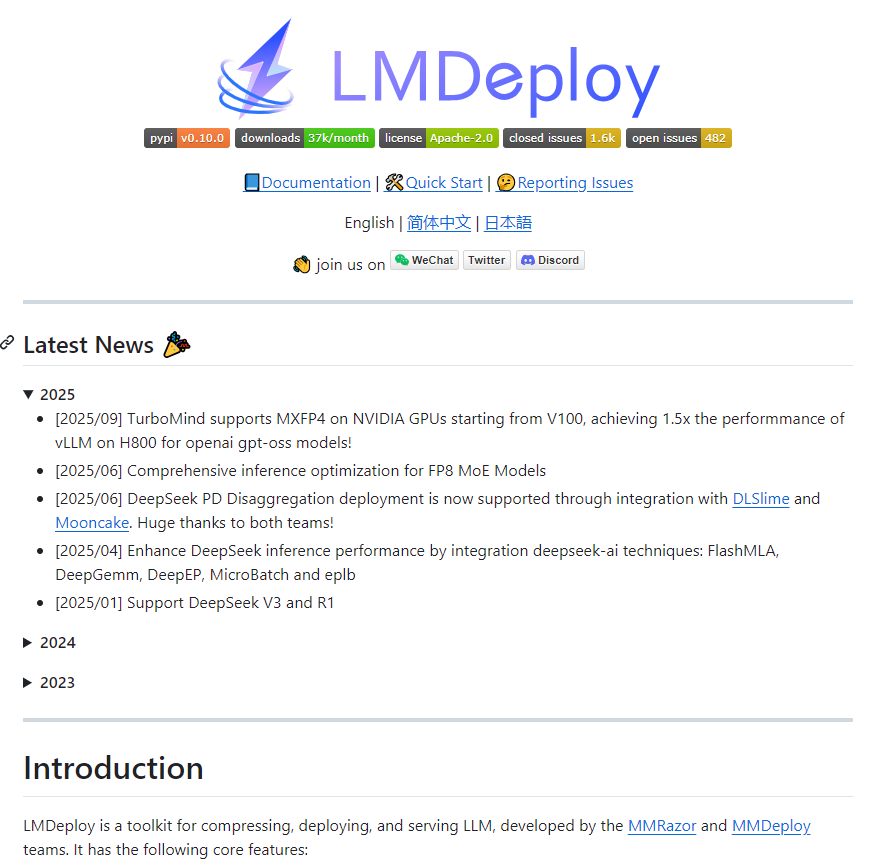 head_dim=128 下性能优化。create_model_inputs 与 schedule_decoding 流程,提高推理效率。chat.py 替换各个引擎的独立实现。logprobs(log 概率)。max_completion_tokens。cache_max_entry_count >= 1 配置。apply_chat_template。head_dim=None 导致的错误。max_session_len 不生效的问题。lmdeploy convert 命令。disable_vision_encoder 失效问题。text_config.tie_word_embedding 参数错误。/chat/completions 流式模式下重复 token 问题。serve --help 无法正常使用的问题。level 参数为字符串时的崩溃问题。eot_token 加入停止词(stop_words)中。dummy_prefill 安全检查。block size 参数的断言检查。get_all_requests 方法返回值类型标注。总结: lmdeploy v0.10.0 在 模型支持、推理性能、硬件适配、部署易用性 上都有了显著增强,尤其 Turbomind 与 Ray MP 后端的升级意义重大。对于需要在多平台部署大模型并追求高性能的开发者,这一版本值得立即升级。
