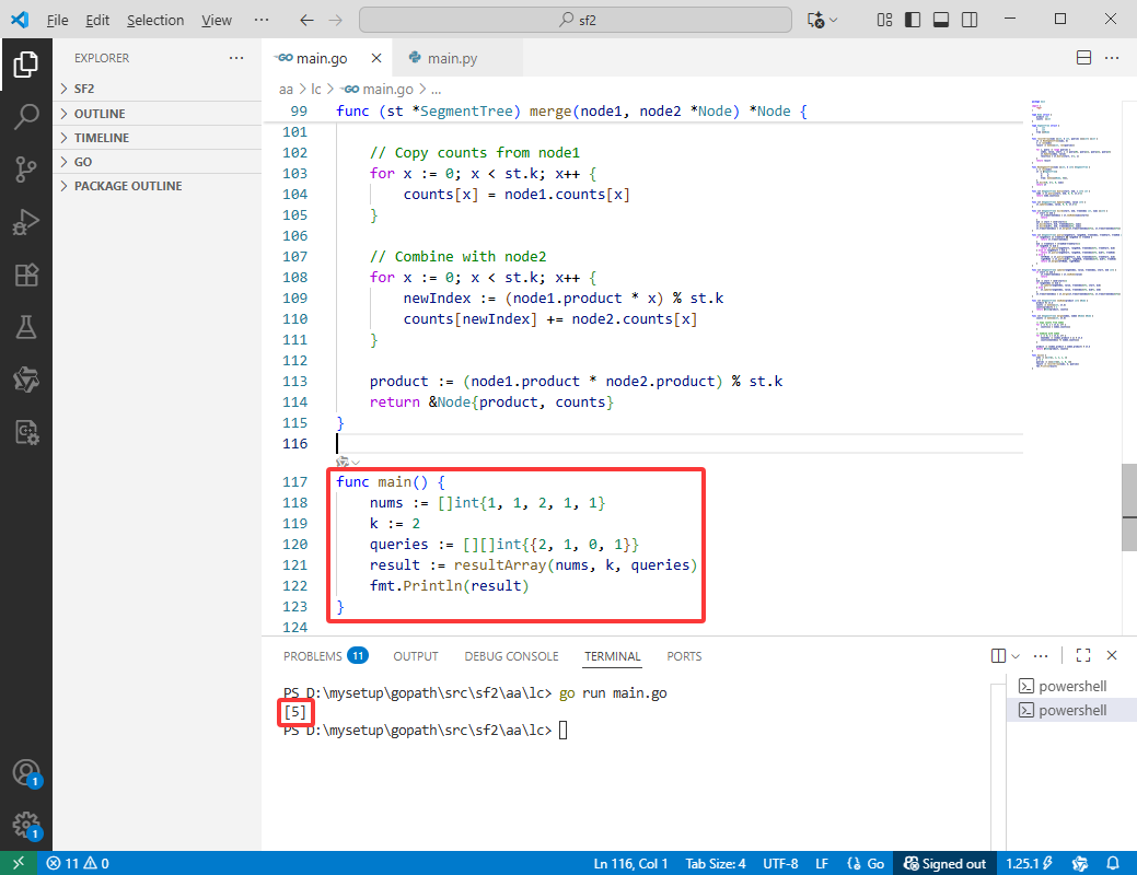 product = (left.product * right.product) % kcounts 初始化为 left.counts 的副本right 的每个余数 r(即 right.counts[r] 表示右区间的前缀乘积模 k 为 r 的数量),