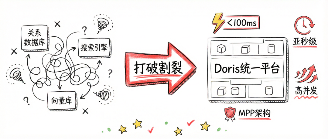 Doris通过倒排索引、向量索引和MPP执行引擎的协同优化,让这种混合查询成为可能,避免了在多个系统间来回切换的低效模式。