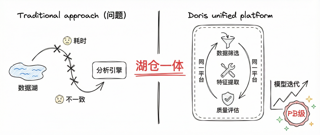 Doris基于湖仓一体架构,直接在开放的数据湖格式上提供高性能分析能力,让数据科学家可以在同一平台上完成数据筛选、特征提取和质量评估。