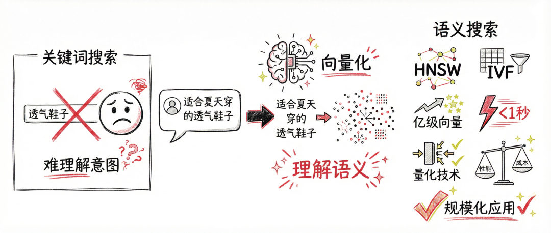 当用户输入适合夏天穿的透气鞋子时,传统关键词搜索很难理解这个需求背后的真实意图。通过向量化技术,系统能够理解查询的语义,召回那些描述方式不同但含义相关的商品。