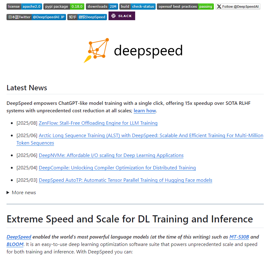 DeepSpeed 发布了 v0.18.0 版本,本次更新在分布式训练性能优化、内存管理、日志系统、模型检查点等方面进行了大量改进和修复,重点增强了 DeepCompile、SuperOffload 以及 ZeRO 优化器 的功能。以下为本次版本的详细更新内容: