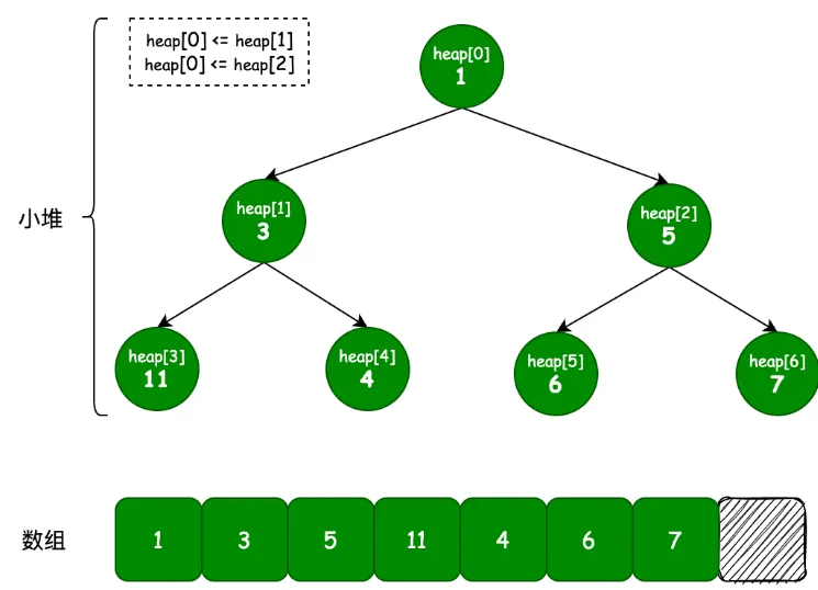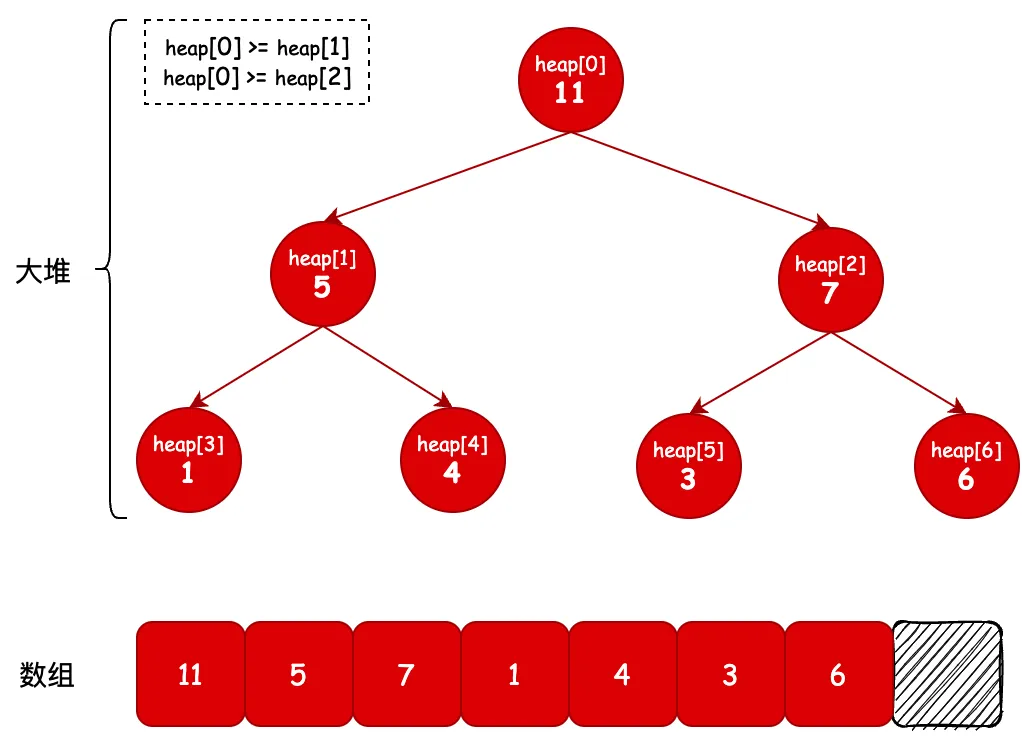 堆是基于树的特殊的数据结构,它可以在数组上构建出树的结构体,并满足堆的属性。堆中某个节点的值总是不大于或者不小于父节点的值,并且堆是一棵完全二叉树