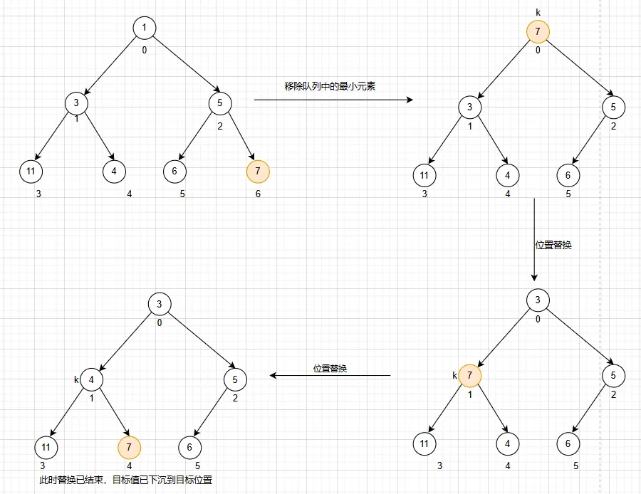 当前队列:[11,5,7,1,4,3,6,null,null,null,null]