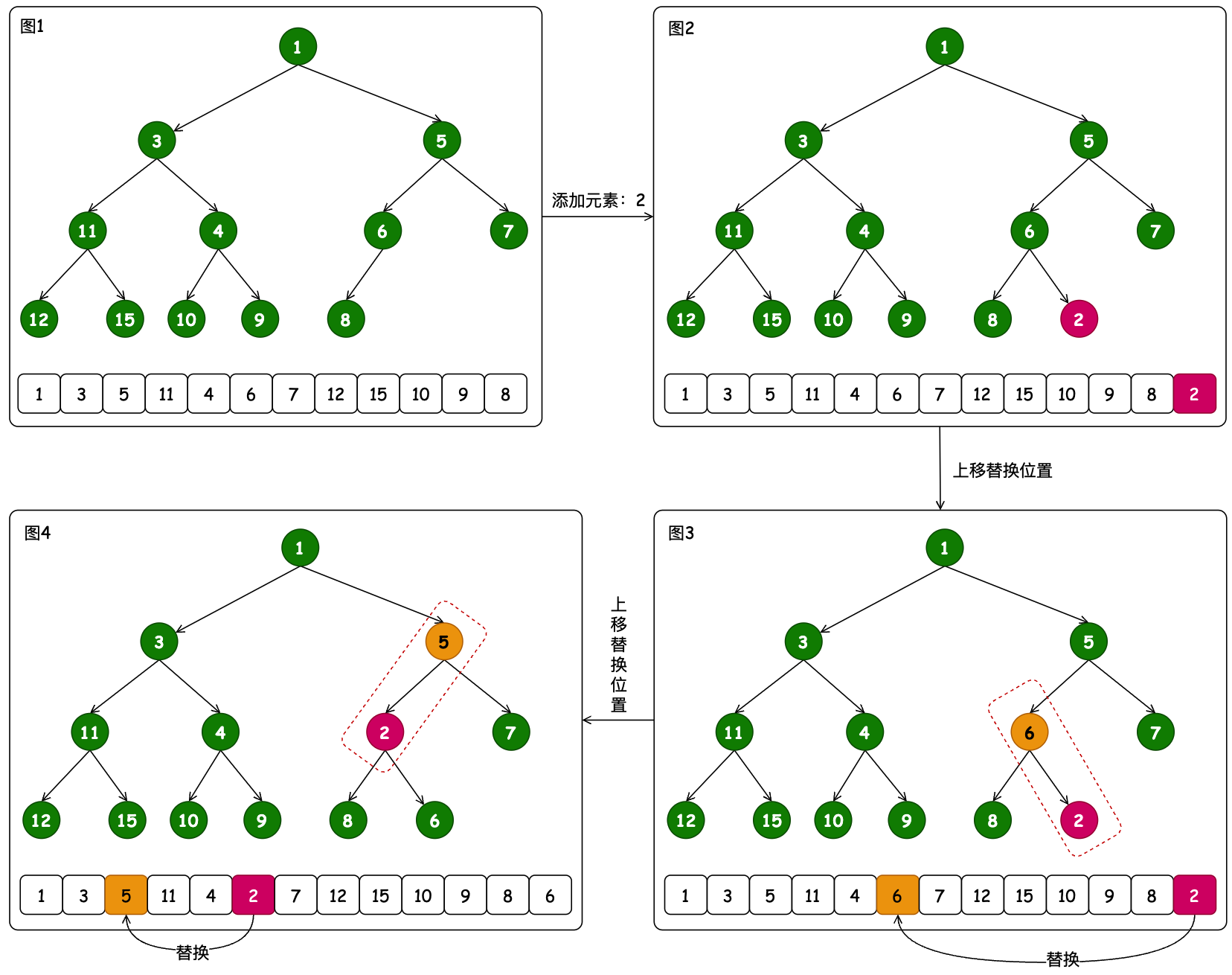 交换过程包括 2->6、2->5,以此交换结束后元素保存完毕。