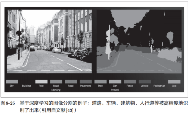 图8-25中对输入图像进行了分割(像素水平的判别)。观察结果可知,在某种程度上正确地识别了道路、建筑物、人行道、树木、车辆等。今后若能基于深度学习使这种技术进一步实现高精度化、高速化的话,自动驾驶的实用化可能也就没那么遥远了。