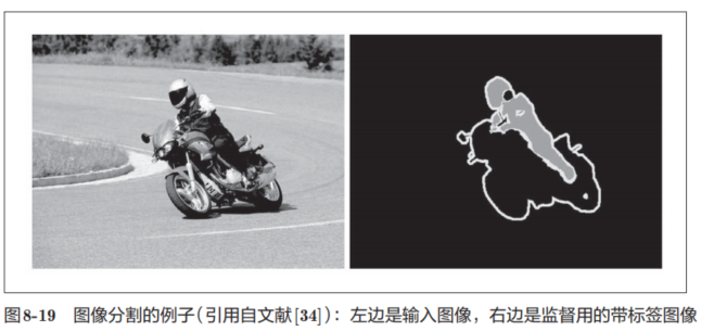图像分割是指在像素水平上对图像进行分类。如图8-19所示,使用以像素为单位对各个对象分别着色的监督数据进行学习。然后,在推理时,对输入图像的所有像素进行分类。