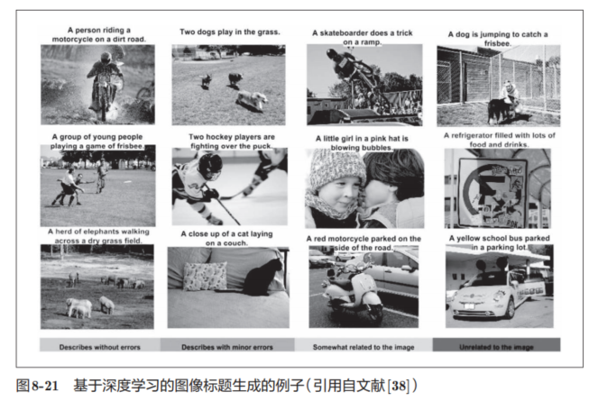 给出一个图像后,会像图8-21一样自动生成表示该图像内容的文本。比如,左上角的第一幅图像生成了文本“A person riding a motorcycle on a dirt road.”(在没有铺装的道路上骑摩托车的人),而且这个文本只从该图像自动生成。文本的内容和图像确实是一致的。并且,令人惊讶的是,除了“骑摩托车”之外,连“没有铺装的道路”都被正确理解了。