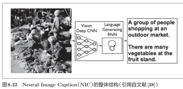 一个基于深度学习生成图像标题的代表性方法是被称为NIC(Neural Image Caption)的模型。如图8-22所示,NIC由深层的CNN和处理自然语言的RNN(Recurrent Neural Network)构成。RNN是呈递归式连接的网络,经常被用于自然语言、时间序列数据等连续性的数据上。