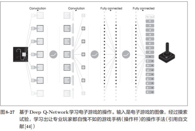 之前在学习电子游戏时,一般是把游戏的状态(人物的地点等)事先提取出来,作为数据给模型。但是,在DQN中,如图8-27所示,输入数据只有电子游戏的图像。这是DQN值得大书特书的地方,可以说大幅提高了DQN的实用性。为什么呢?因为这样就无需根据每个游戏改变设置,只要给DQN游戏图像就可以了。实际上,DQN 可以用相同的结构学习《吃豆人》、Atari等很多游戏,甚至在很多游戏中取得了超过人类的成绩。