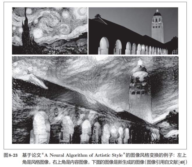如图8-23所示,如果指定将梵高的绘画风格应用于内容图像,深度学习就会按照指示绘制出新的画作。