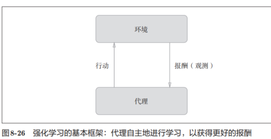 图8-26中展示了强化学习的基本框架。这里需要注意的是,报酬并不是确定的,只是“预期报酬”。