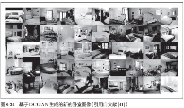 刚才的图像风格变换的例子在生成新的图像时输入了两个图像。不同于这种研究,现在有一种研究是生成新的图像时不需要任何图像(虽然需要事先使用大量的图像进行学习,但在“画”新图像时不需要任何图像)。比如,基于深度学习,可以实现从零生成“卧室”的图像。图8-24中展示的图像是基 于 DCGAN(Deep Convolutional Generative Adversarial Network) 方法生成的卧室图像的例子
