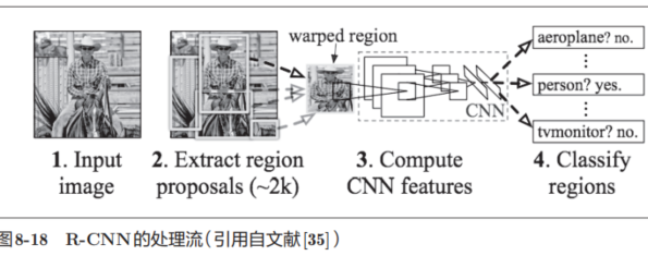 在使用CNN进行物体检测的方法中,有一个叫作R-CNN的有名的方法。图8-18显示了R-CNN的处理流