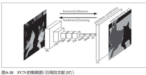 要基于神经网络进行图像分割,最简单的方法是以所有像素为对象,对每个像素执行推理处理。比如,准备一个对某个矩形区域中心的像素进行分类的网络,以所有像素为对象执行推理处理。正如大家能想到的,这样的方法需要按照像素数量进行相应次forward处理,因而需要耗费大量的时间(正确地说,卷积运算中会发生重复计算很多区域的无意义的计算)。为了决这个无意义的计算问题,有人提出了一个名为FCN(Fully Convolutional Network)[37]的方法。该方法通过一次forward处理,对所有像素进行分类(图 8-20)。