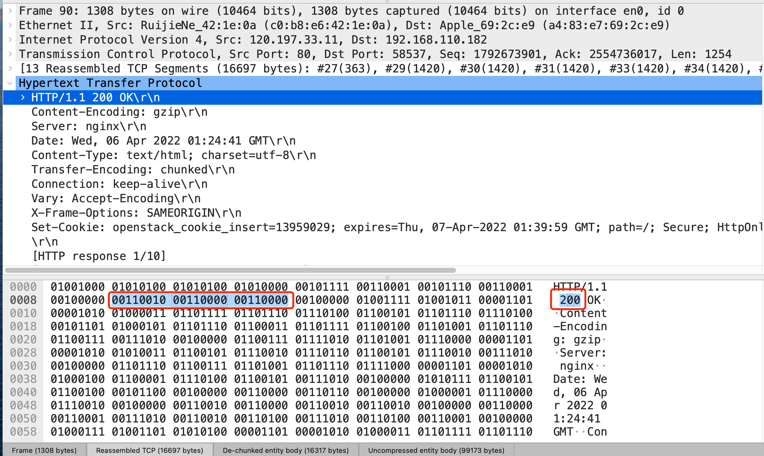 比如状态码 200 ,在 HTTP/1.1 是用 ‘2’‘0’‘0’ 三个字符来表示(二进制:00110010 00110000 00110000),共用了 3 个字节,如下图