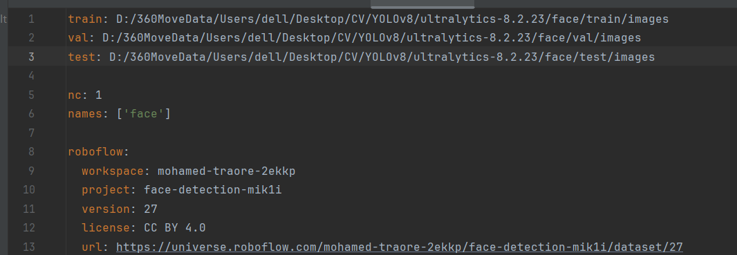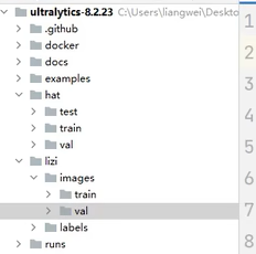 在yolov8根目录下(也就是本文所用的ultralytics-8.2.0目录下)创建一个新的data.yaml文件,也可以是其他名字的例如hat.yaml文件,文件名可以变但是后缀需要为.yaml,内容如下,test可有可无