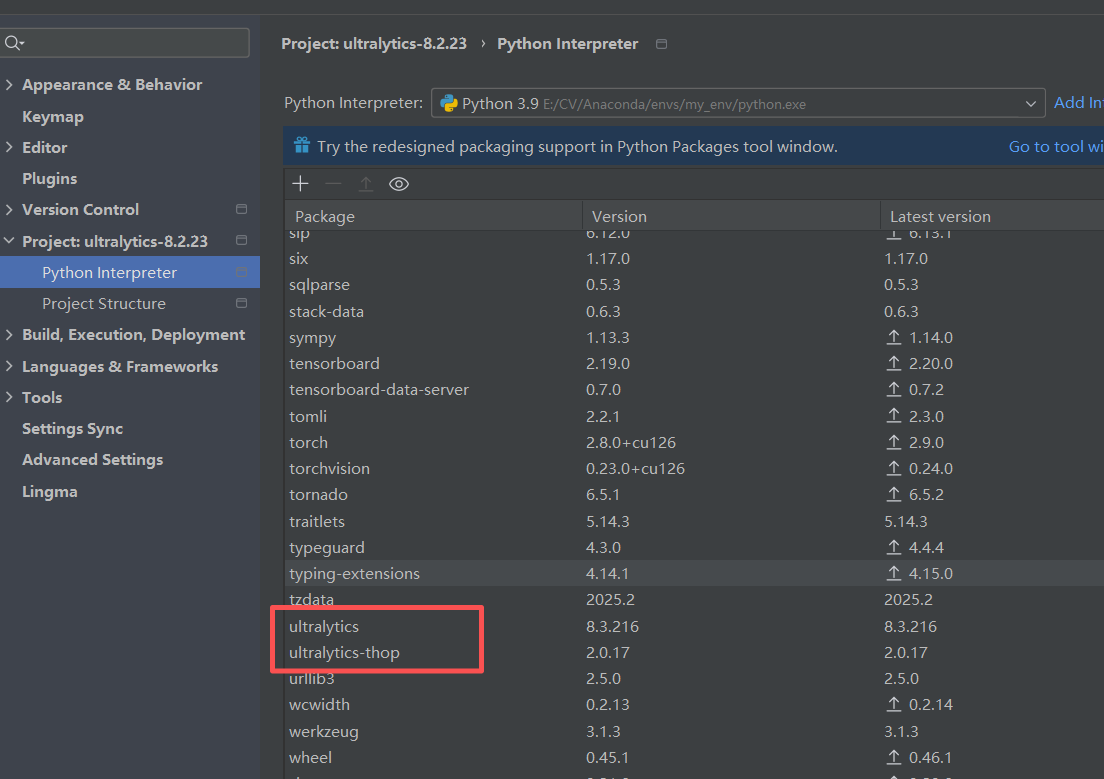 先检查虚拟环境中是否有ultralytics包,没有的话需要安装