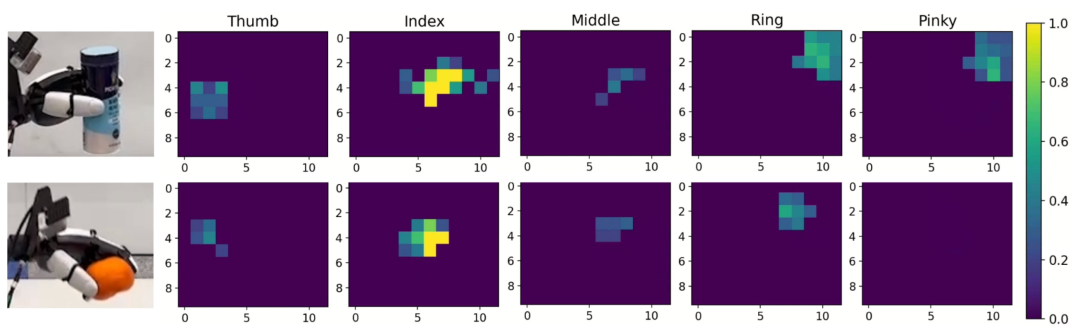 Representative cases of grasping cylindrical and spherical objects, visualizing the distribution of surface contacts measured by tactile sensors at fingertips.[1]