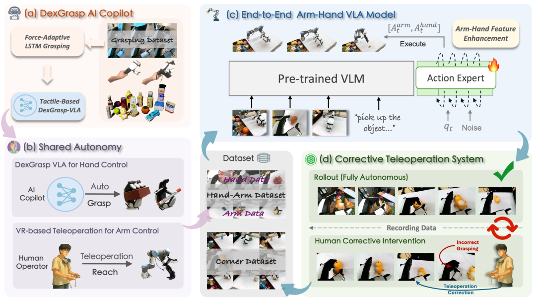 ByteDance Seed 团队最新的研究论文《End-to-End Dexterous Arm-Hand VLA Policies via Shared Autonomy》[1],针对这一关键问题提出了解决方案。
