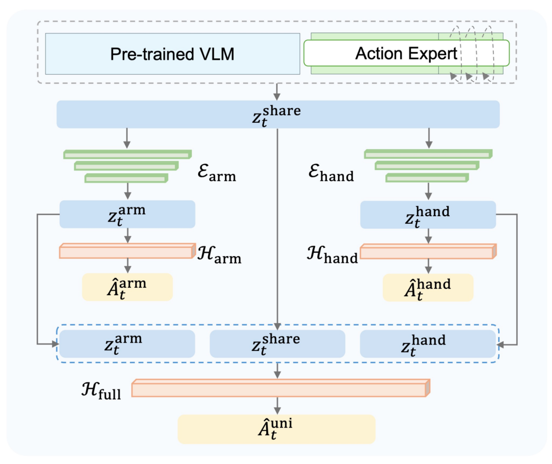 该模块旨在建模和融合臂和手在运动学上的差异特征。它采用三流架构:共享任务表示、手臂专用编码器和手部专用编码器。这种解耦设计避免了传统单体架构模型对臂手差异的忽视,使得最终的策略能够实现更自然、更鲁棒的宏观 - 微观动作协调。