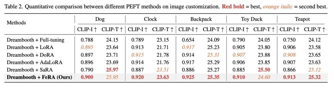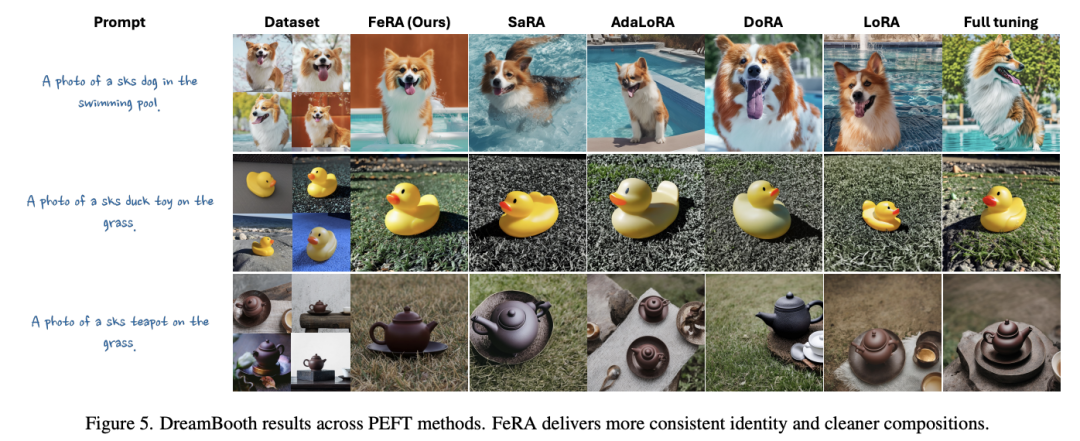 在 DreamBooth 任务(如让特定的狗游泳、让特定的茶壶放在草地上)中,FeRA 展示了惊人的文本可控性。