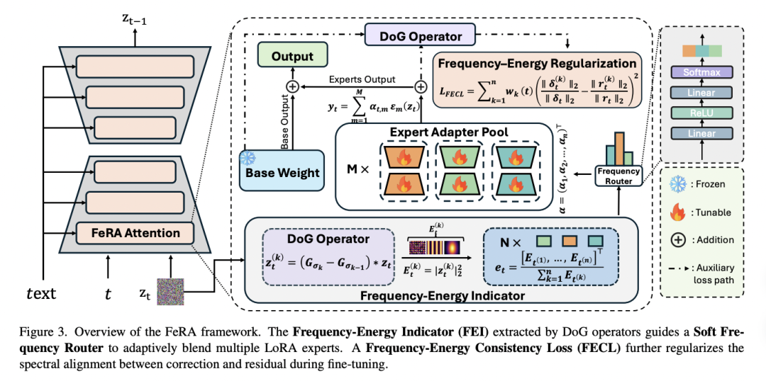这是 FeRA 的「眼睛」,不同于以往方法仅依赖离散的时间步(Timestep)作为条件,FeRA 利用 高斯差分 (Difference-of-Gaussians, DoG) 算子,在潜空间直接提取特征的频域能量分布。