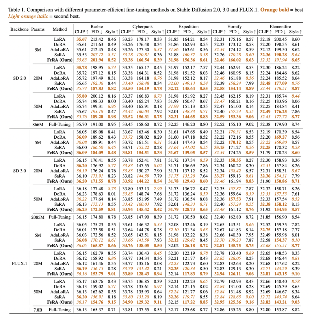 FeRA 摒弃了传统的静态微调思路,通过实时感知潜空间(Latent Space)的频域能量分布,动态调度不同的专家模块。实验结果显示,FeRA 在 SD 1.5、SDXL、Flux.1 等多个主流底座上,于风格迁移和主体定制任务中均实现了远超 baseline 的生成质量。
