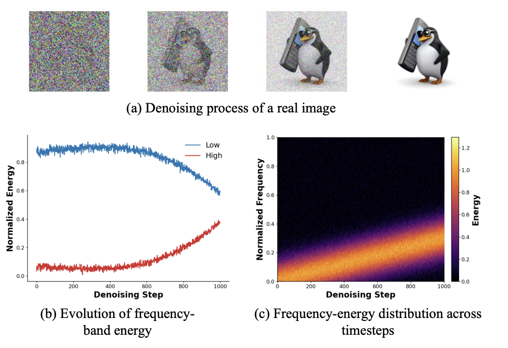 扩散模型的去噪过程(Denoising Process)本质上是一个从无序到有序的物理演变。研究团队通过对中间层特征的频谱分析发现,这一过程并非各向同性,而是具有鲜明的阶段性特征: