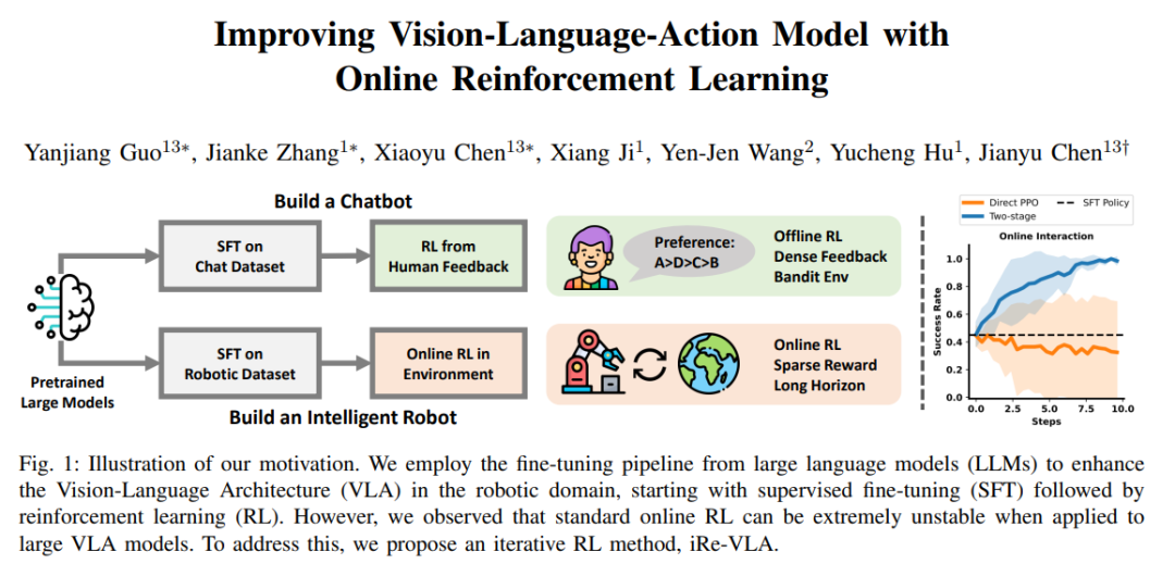 在具身智能(Embodied AI)领域,科学家们正在尝试将强大的视觉-语言模型(VLM)应用到机器人的底层控制中,这就是所谓的VLA模型。通常,这些模型是通过模仿人类专家的示范数据(监督微调,SFT)来学习的。