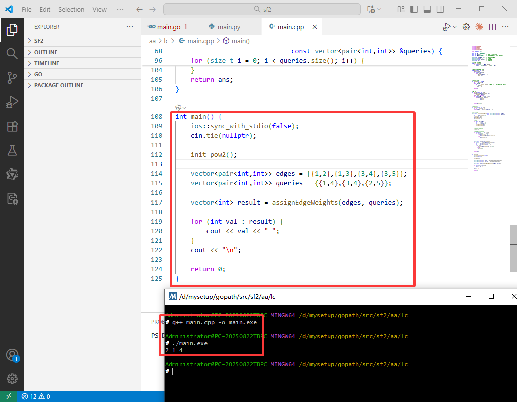 2025-11-10:给边赋权值的方案数Ⅱ。用go语言,给一棵以节点 1 为根的无向树,共 n 个节点,边集由长度为 n−1 的数组 edges 给出(edges[i] = [ui, vi] 表示 ui 与 vi 之间有条边)。起初每条边的权重为 0,你可以把任意边的权重改为 1 或 2。