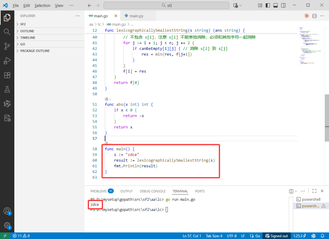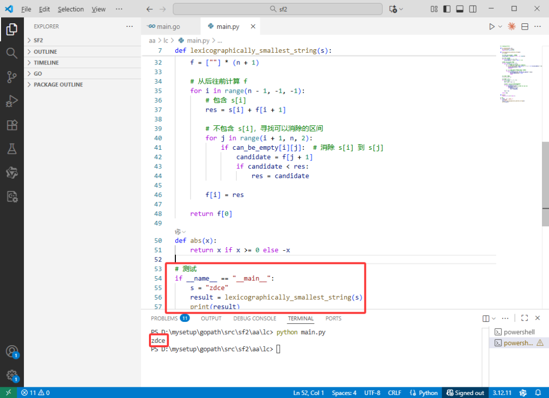 s 的长度 n。n x n 的二维布尔数组 canBeEmpty。这个数组用于记录子串 s[i:j+1](即从索引 i 到索引 j 的子串)是否可以通过题目描述的移除操作被完全删除(即变为空字符串)。canBeEmpty[i][j] = true 表示该子串可被完全移除。canBeEmpty 表i 从 n-2 递减到 0,对于每个 i,索引 j 从 i+1 开始,以步长2递增到 n-1(因为每次移除两个字符,只有长度为偶数的子串才有可能被完全移除)。(i, j),通过以下两种方式判断子串 s[i:j+1] 是否可被完全移除:s[i]和s[j]在字母表上是相邻的(包括循环相邻,如'a'和'z'),并且它们之间的子串s[i+1:j]已经被判定为可完全移除(即canBeEmpty[i+1][j-1]为true),那么移除中间部分后再移除这对相邻字符,整个子串就可以被清空。此时,将canBeEmpty[i][j]设为true。k(i+1到j-2之间,且步长为2),使得子串s[i:k+1]和s[k+1:j+1]都可以被完全移除(即canBeEmpty[i][k]和canBeEmpty[k+1][j]均为true),那么整个子串s[i:j+1]也可以被移除。算法会检查所有可能的分割点k,一旦找到满足条件的分割点,就将canBeEmpty[i][j]设为true。f,其长度为 n+1。f[i] 表示从原始字符串的第 i 个位置开始(即子串 s[i:])到末尾,经过若干次移除操作后能得到的字典序最小的字符串。i 从 n-1 递减到 0):f[n] 被初始化为空字符串,表示超出字符串末尾的情况。i,考虑两种可能,并选择字典序更小的结果作为 f[i]:s[i]:将 s[i] 与后面子串的结果 f[i+1] 拼接起来,形成一种可能的结果。i 开始的某个子串:遍历所有可能的 j(j 从 i+1 到 n-1,步长为2),如果子串 s[i:j+1] 可以被完全移除(即 canBeEmpty[i][j] 为 true),那么可以考虑直接跳过这个子串,将后面子串的结果 f[j+1] 作为当前的可能结果。这是因为移除这个子串不会在结果中留下任何字符。f[i]。f[0],它代表了从字符串开头到末尾的整个字符串经过操作后能得到的最小字典序字符串。canBeEmpty 表需要三层循环:外层循环 i 为 O(n),内层循环 j 为 O(n),最内层寻找分割点 k 的循环也是 O(n)。因此这部分是 O(n³)。f 的过程也需要两层循环:外层循环 i 为 O(n),内层循环 j 为 O(n)。但在每次比较和拼接字符串时,最坏情况下字符串长度可能为 O(n),因此这部分的时间复杂度也是 O(n³)。canBeEmpty,它占用 O(n²) 的空间。f 存储了 n+1 个字符串,在最坏情况下,每个字符串的长度可能为 O(n),因此存储 f 也需要 O(n²) 的空间。这个算法通过动态规划系统地探索了所有移除可能性,并确保最终得到的是字典序最小的结果。对于题目中约定的字符串长度(n <= 250),O(n³) 的复杂度在可接受范围内。