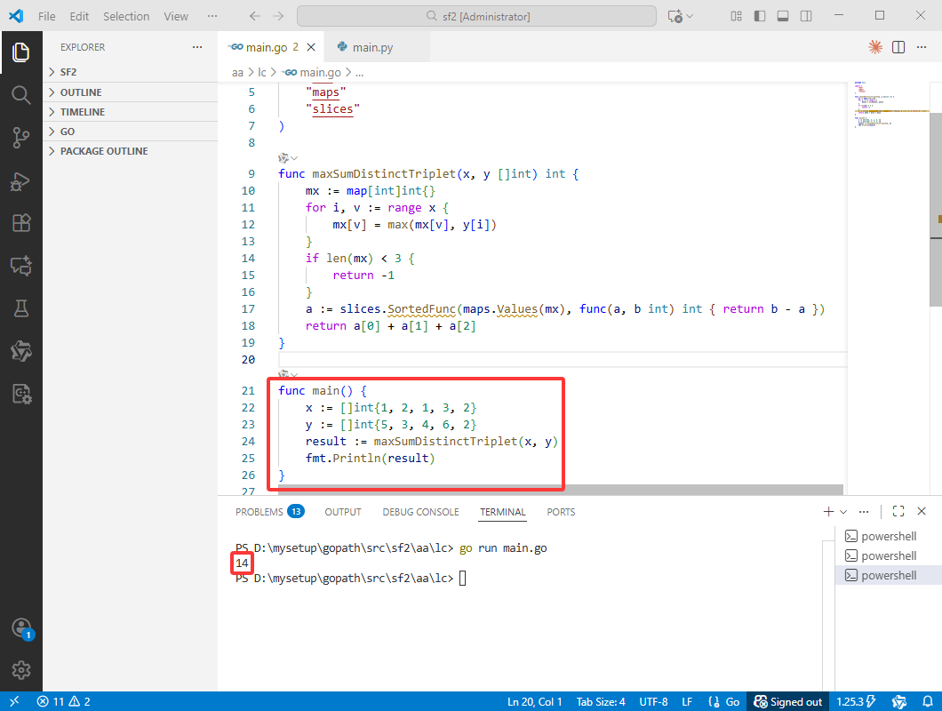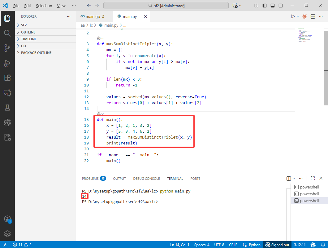 2025-11-19:选择不同 X 值三元组使 Y 值之和最大。用go语言,给定两个长度相同的整数数组 x 和 y(长度为 n)。