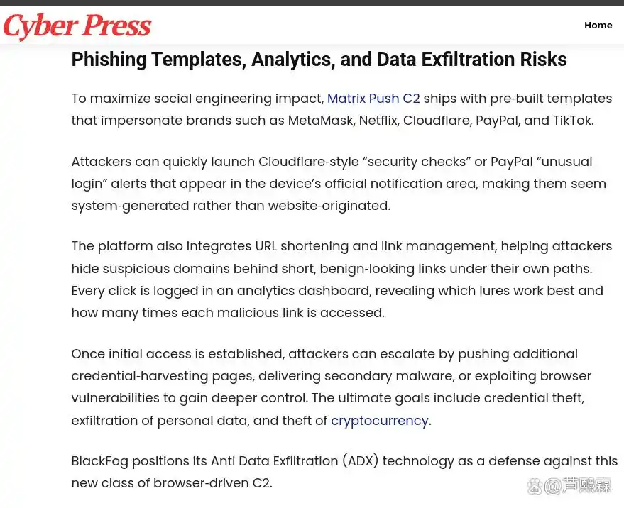 Matrix Push C2 代表了浏览器攻击的新范式:利用合法 API 实现持久化,以最小技术代价达成最大欺骗效果。其成功暴露了当前 Web 安全模型在权限委托机制上的根本缺陷——过度依赖用户判断,而忽视自动化策略与运行时防护。