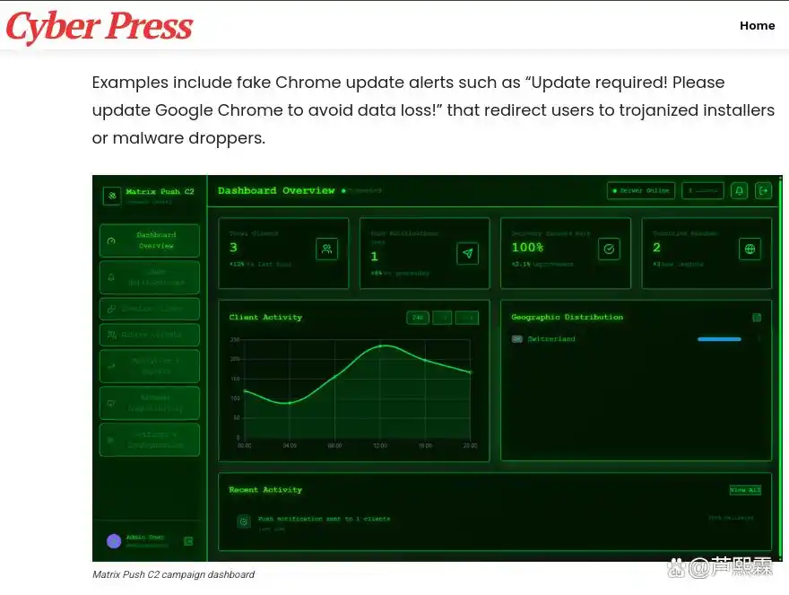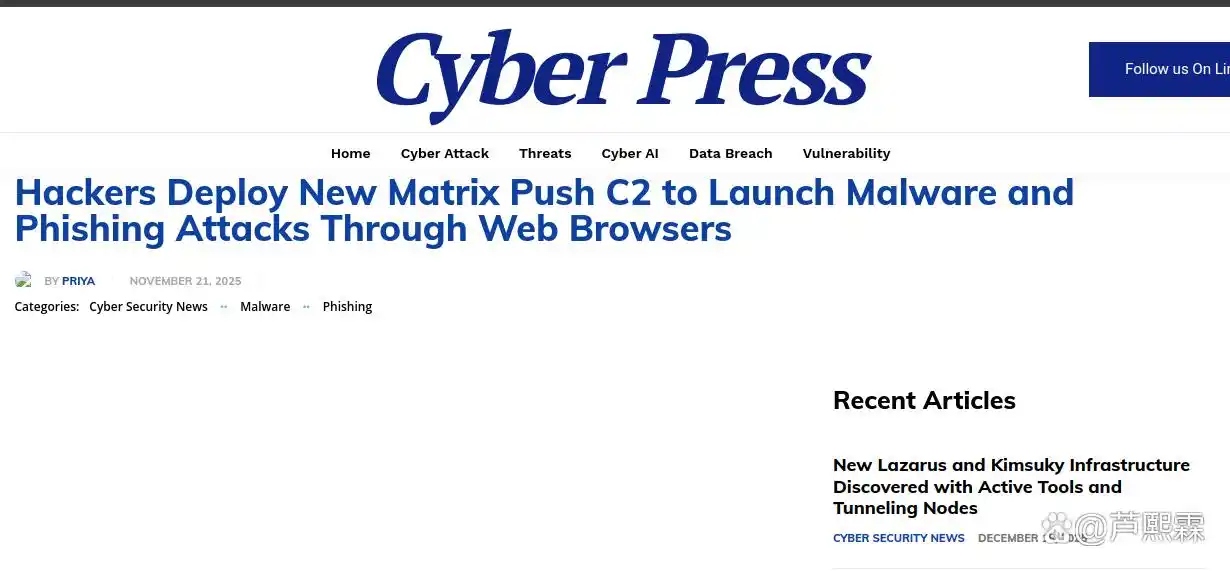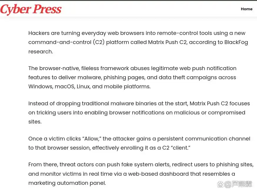 现代 Web 浏览器已从单纯的文档渲染工具演变为功能完备的操作系统级应用平台。HTML5 引入的 Web Push API 允许网站在用户关闭标签页后仍能发送系统级通知,极大提升了用户体验。然而,这一机制亦被攻击者武器化。2025年曝光的 Matrix Push C2 平台即典型代表:它不依赖可执行文件下载或浏览器漏洞利用,而是通过社会工程诱导用户主动授予通知权限,从而建立长期、隐蔽的 C2 通道。