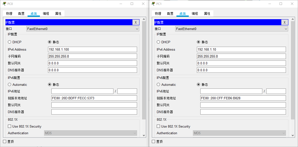 Switch(config-if)#switchport port-security mac-address 0000.0CB6.B828 //配置静态绑定2.主机配置(设置 IP 地址和子网掩码就可以,这里 就没有去划分 VLAN ,交换机所有接口都属于 VLAN 1