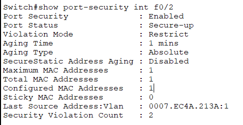 Switch(config-if)#switchport port-security maximum 1 //设置端口活跃 MAC 地址数量为1个