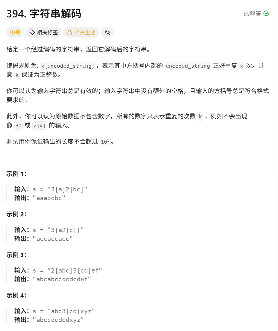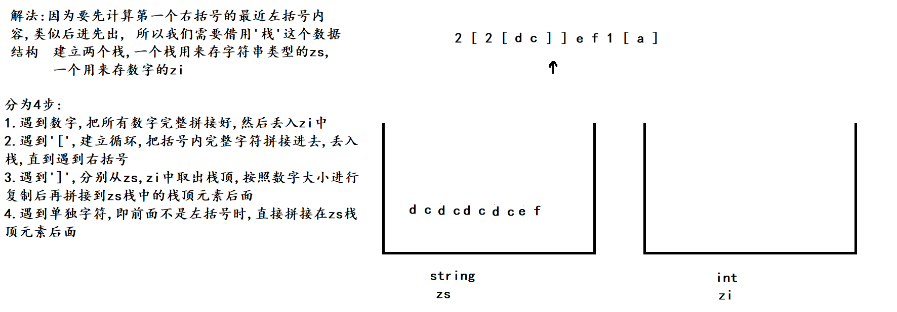}类似于加括号的计算器运算, 这里也是先计算括号里面的, 但不同的是括号中的是字母,我们要根据括号外面的数字字符,来进行对应次数的复制