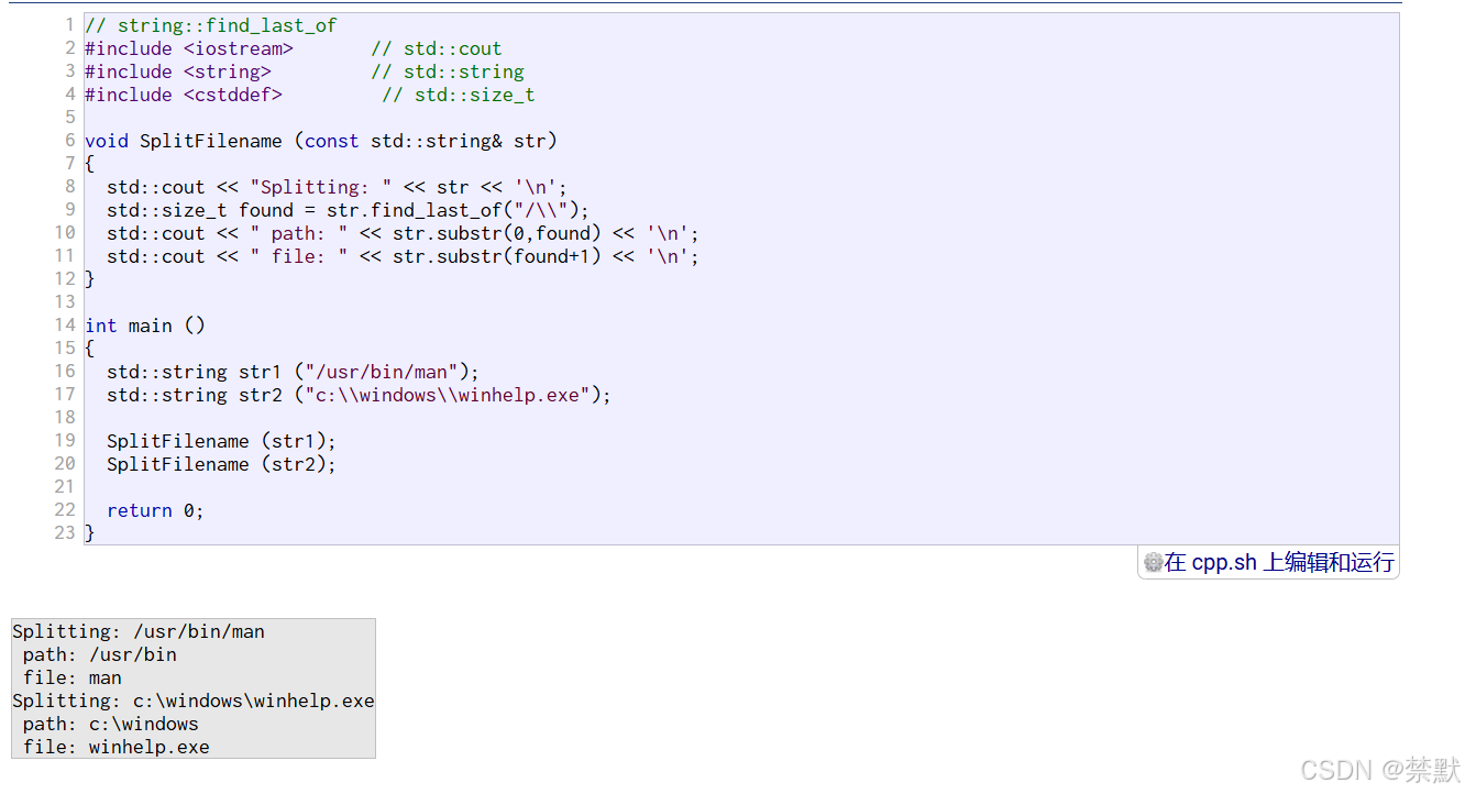 string str; str.push_back(' '); // 在str后插入空格 str.append("hello"); // 在str后追加一个字符"hello" str += 'w'; // 在str后追加一个字符'b' str += "orld"; // 在str后追加一个字符串"it" cout << str << endl; cout << str.c_str() << endl; // 以C语言的方式打印字符串