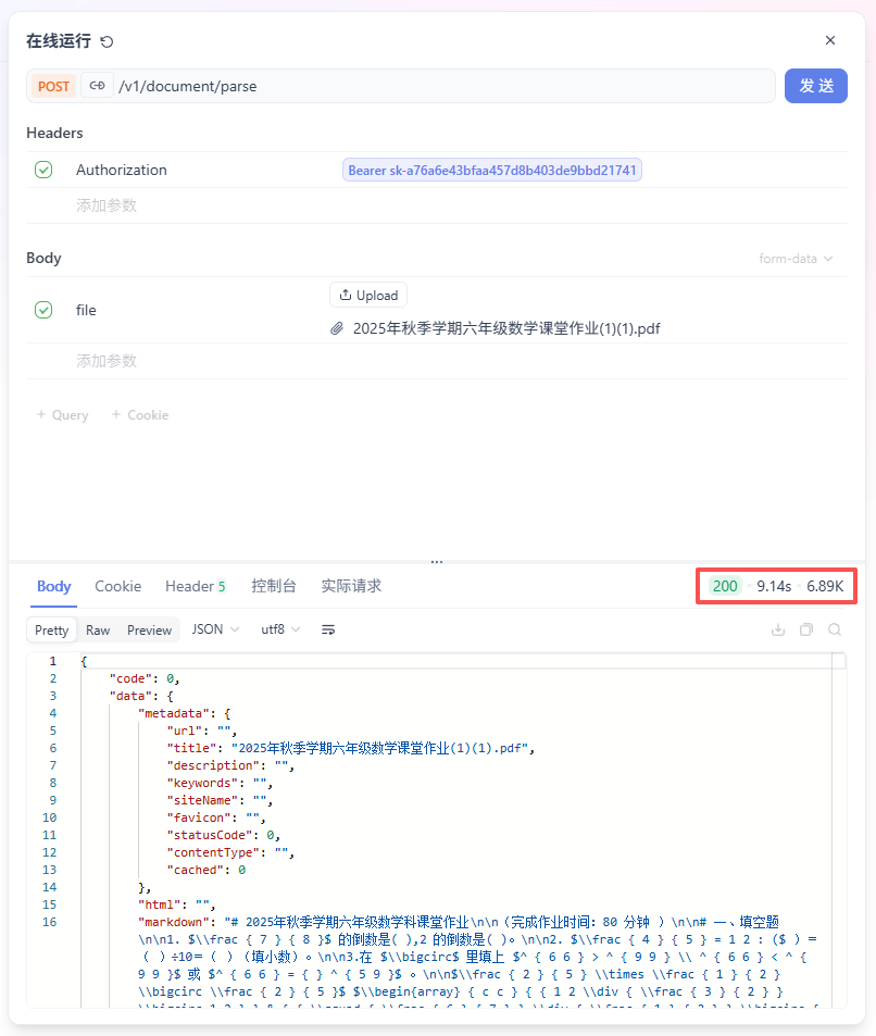 API将以JSON格式返回响应。解析后的结构化文本,将清晰地封装在 markdown 字段中,便可直接提取和使用。