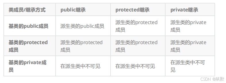 3. 实际上面的表格我们进行一下总结会发现,基类的私有成员在子类都是不可见。基类的其他
