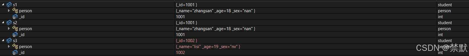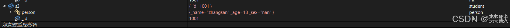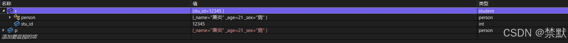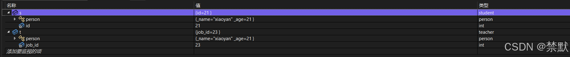 Student 和 Teacher 复用了 Person 的成员。下面我们使用监视窗口查看s tudent 和t eacher 对象,可