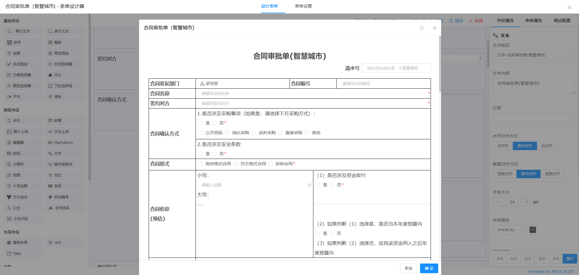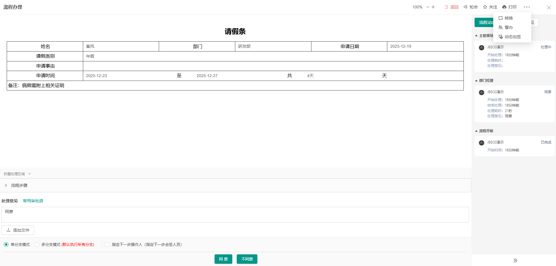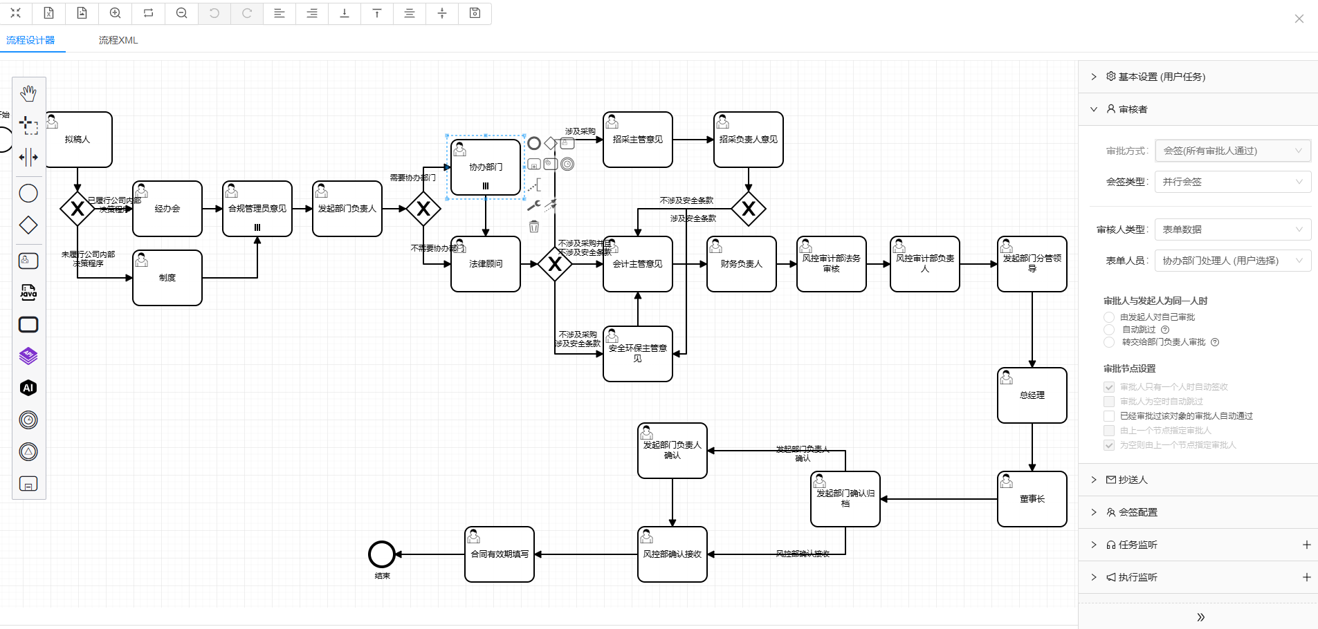 JeecgBoot对流程进行了全面扩展,支持常规审批和会签审批两种模式,同时支持审批人与发起人为同一人时的智能处理,以及丰富的审批节点设置选项,能够更好地满足复杂审批业务场景的使用需求。