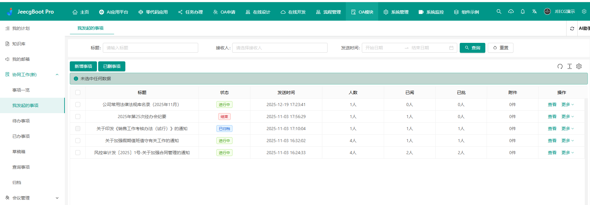 协同工作模块支持发起自定义事项,灵活配置处理方式和参与人员,实现高效的团队协作。