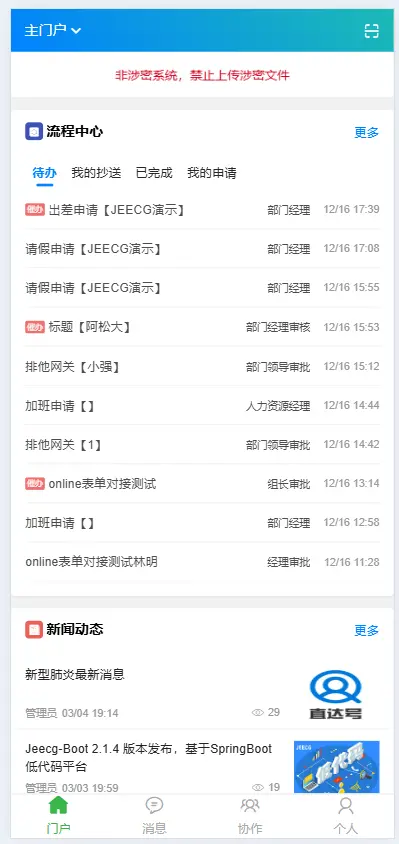 门户首页将系统的待办任务、新闻管理、会议、邮箱、消息通知、快捷应用等整合在统一的门户中,用户可以快速处理任务、发起审批等操作,同时支持PC端和移动端的个性化样式设计。