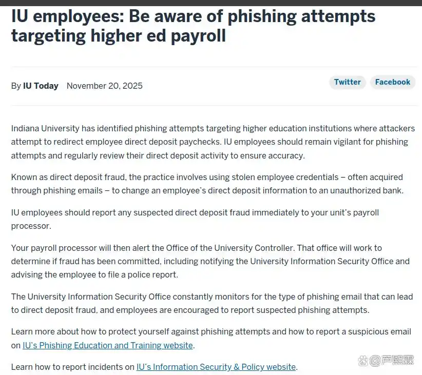 高等教育机构因其开放的网络环境、分散的IT治理结构以及大量高学历但非技术背景的员工群体,长期被视为网络犯罪分子的理想目标。根据Educause 2024年度安全报告,超过68%的美国高校在过去两年内遭遇过针对薪酬系统的钓鱼攻击,其中近三成导致实际资金损失。2025年11月,印第安纳大学(IU)公开通报了一起典型的工资单钓鱼事件:攻击者通过伪造人力资源部门邮件,诱骗员工在仿冒的统一认证页面输入凭据,随后利用窃取的账号修改其工资直接存款账户,试图将薪资转入第三方控制的银行账户。